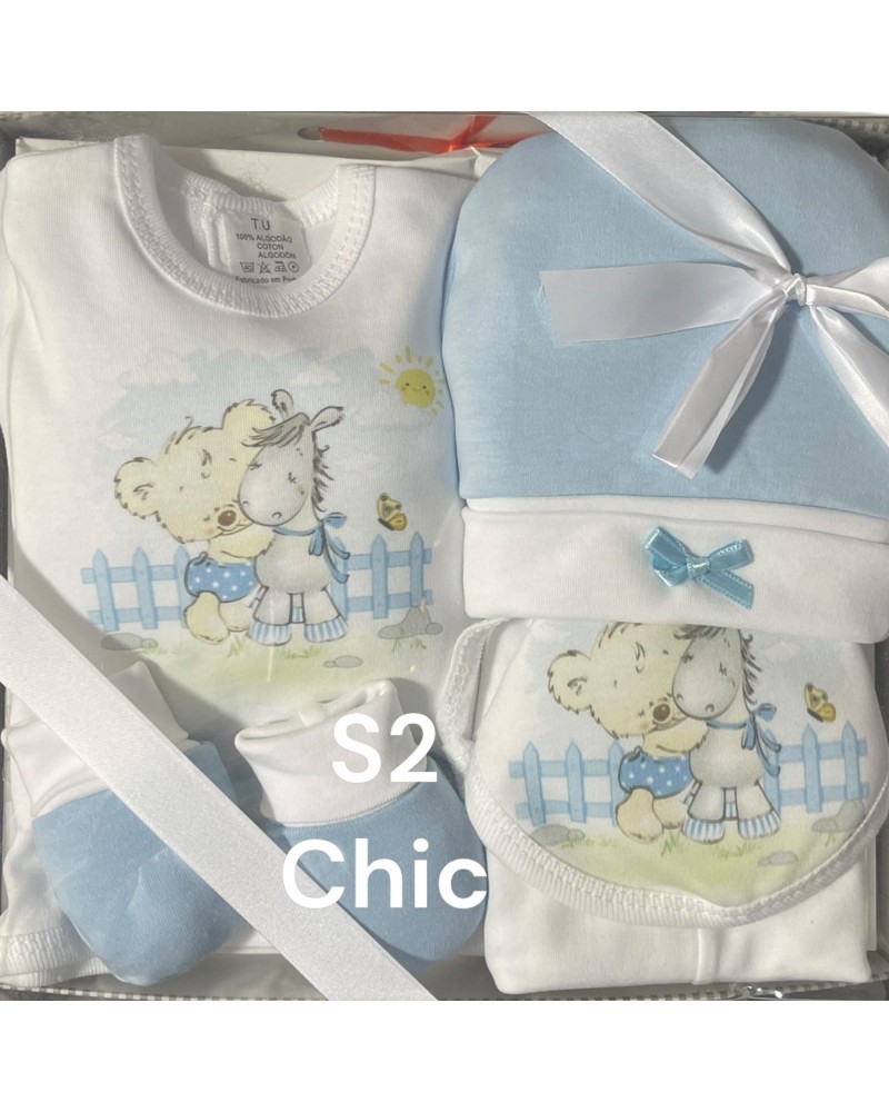 Gorro, babero, manoplas, chaquetita y polaina