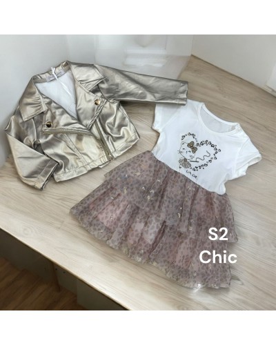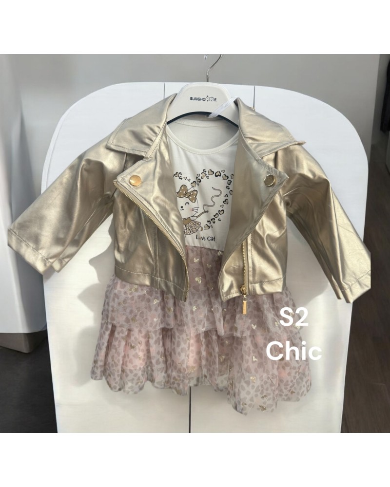 Conjunto compuesto por chaqueta de polipiel y vestido con la parte de bajo de tul