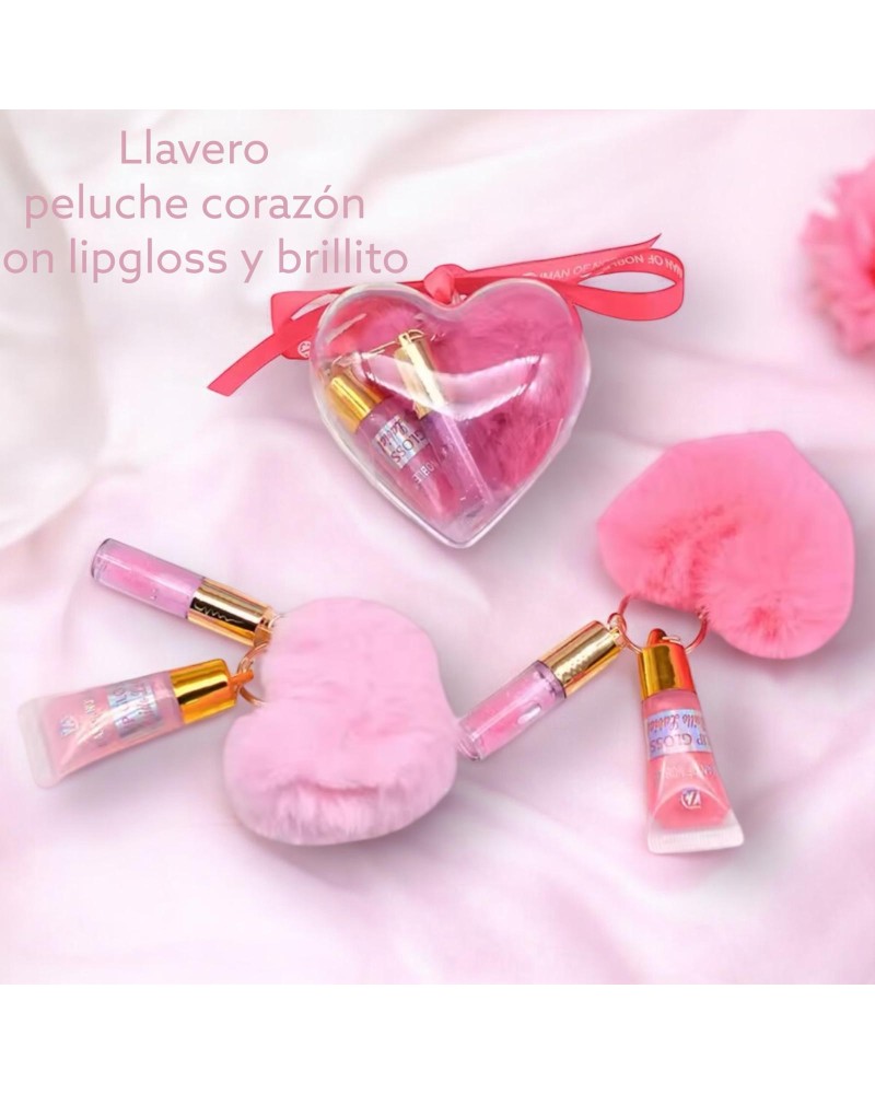 Cajita en forma de corazón compuesta por llavero peludito de corazón y dos lip gloss pequeños