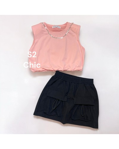 Conjunto compuesto por top con detalle colgante y hombreras y falda pantalón estilo cargo