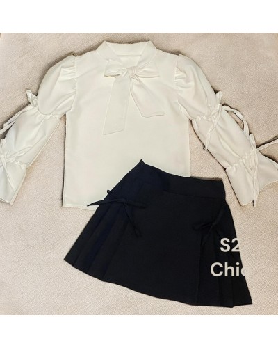 Conjunto compuesto por blusa con detalle lazos y falda de tablas