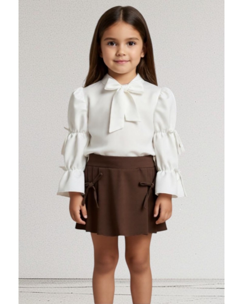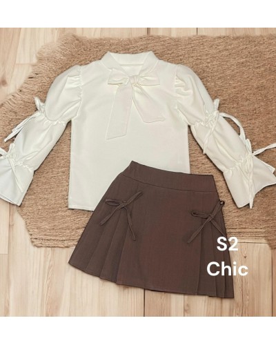 Conjunto compuesto por blusa con detalle lazos y falda de tablas